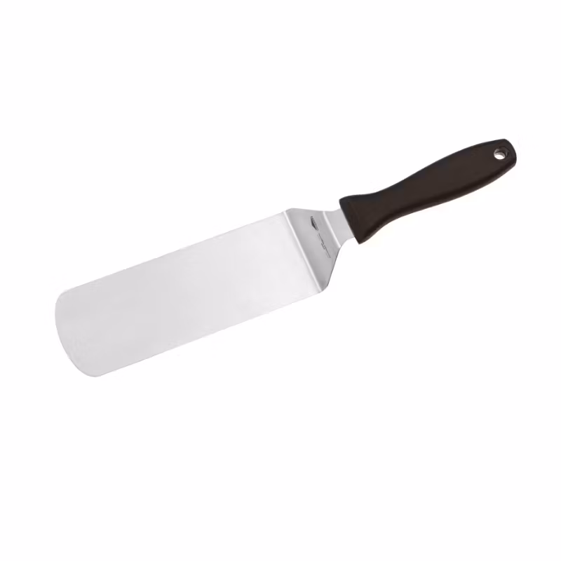 Praktisk stekspade i rostfritt med plasthandtag för exempelvis hamburgare.
